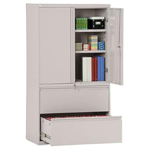 Product Description : Color: Light GrayTwo 19 1/4 deep file drawers operate on steel ball bearing, telescoping slide suspensions and hold letter and legal files. Reinforced double-wall drawer fronts provide extra stability. Cabinet provides ample storage and features hinged doors with full-length recessed pulls and two adjustable shelves. Single-key core removable locks with four keys. Four adjustable leveling glides. Metal construction with a durable powder coated finish. Color(s): Light Gray; Width: 36 in; Depth: 19 1/4 in; Height: 65 1/4 in.